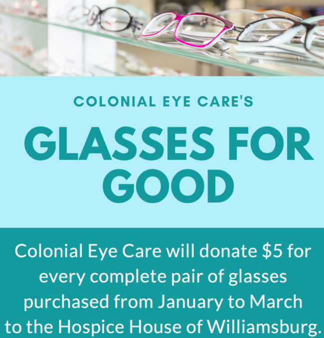 WILLIAMSBURG — Colonial Eye Care, 5273 John Tyler Hwy, is partnering with the Hospice House & Support Care of Williamsburg by donating $5 for every pair of glasses sold.