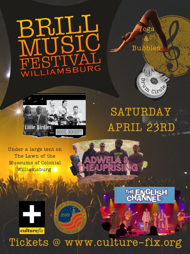 The festival, sponsored by CultureFix, is set to take place on Saturday, April 23 through Sunday, April 24 on the lawn of the Art Museums of Colonial Williamsburg (301 S. Nassau St.). The weekend will be filled with not only a great line up of performers, but activities including Yoga and Bubbles, as well as food and beverage options from area food trucks and breweries.