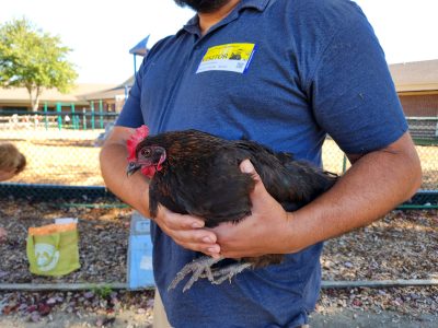 Following the presentation, students had the opportunity to pet Dusty as Diaz held the Rustic Rambler chicken.
