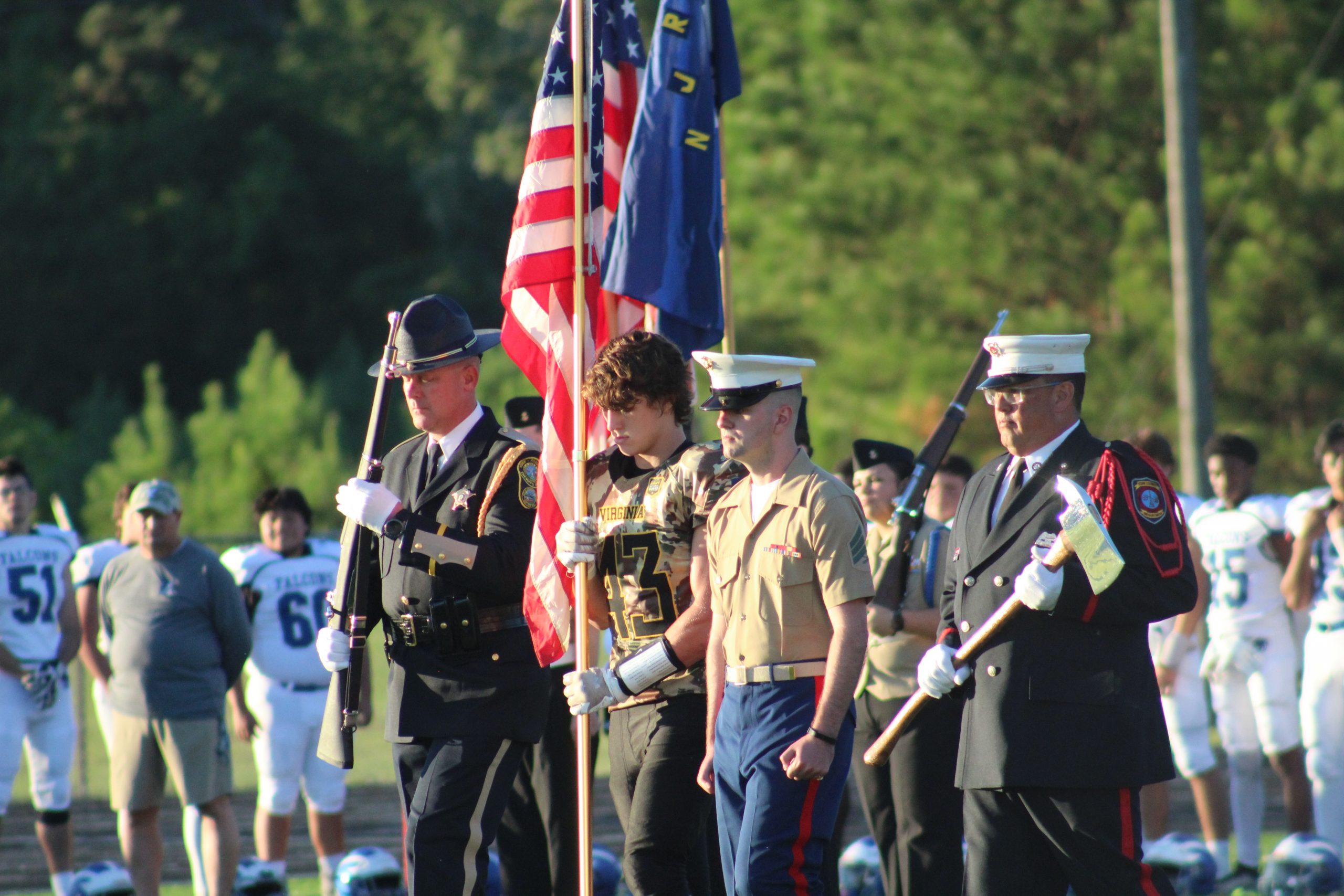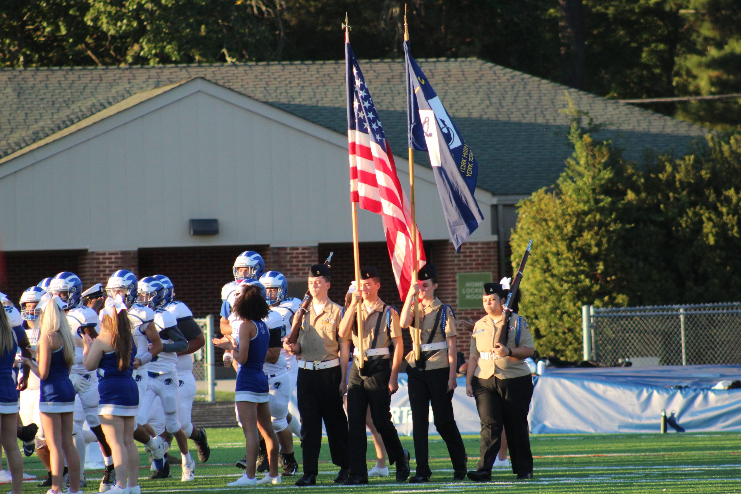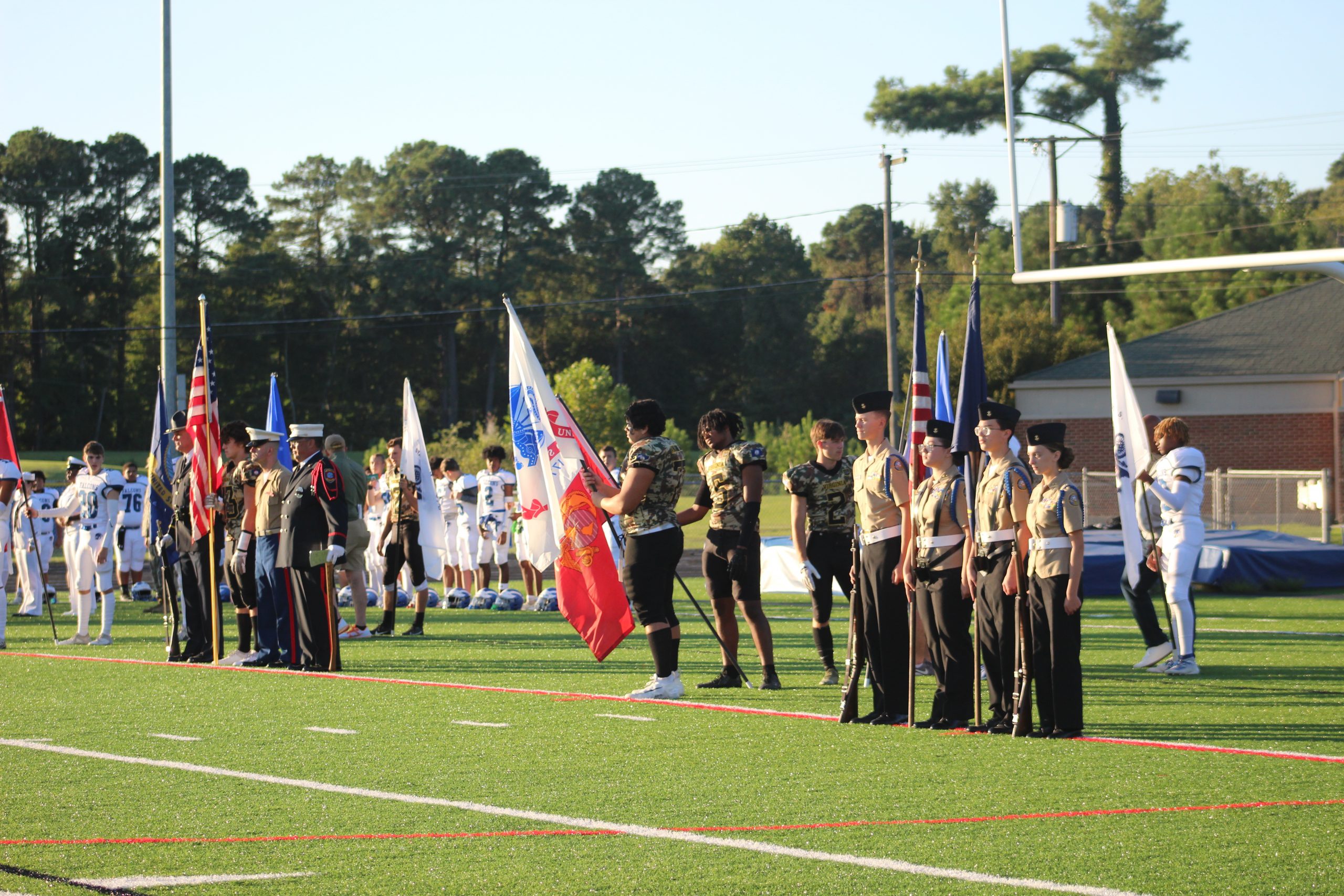 Pregame ceremonies included a rendition of the Armed Forces Medley, where all service members were encouraged to stand during their branch song. American flags were handed out to spectators. Members of both schools carried out each military branch’s flag and both high schools represented their JROTC teams with color guard honors.