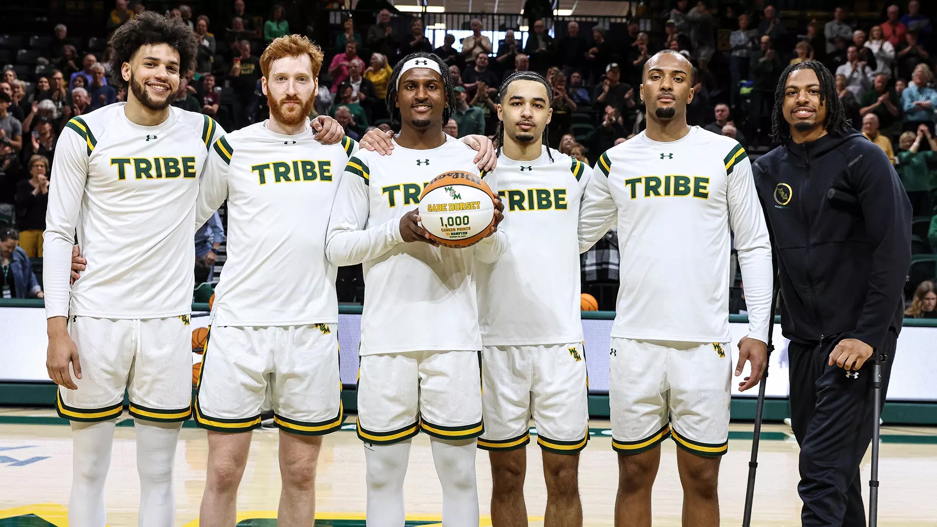 The Tribe answered with a 10-2 spurt of its own to extend the lead back to double digits. Caleb Dorsey scored half W&M’s points during the stretch, including a 3-point play with 1:23 left in the half to give W&M a 37-27 lead. The Green and Gold maintained that 10-point advantage, 41-31, to the intermission thanks to a Caleb Dorsey lay-up in the closing seconds.