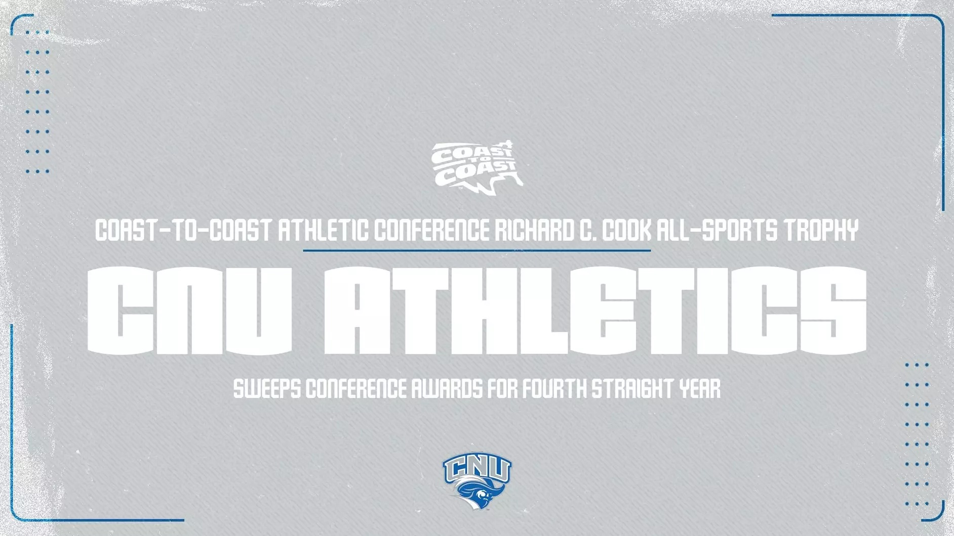 NEWPORT NEWS — Powered by six conference championships and eight more runner-up finishes in 2024-25, the Christopher Newport Department of Athletics secured the Richard C. Cook All-Sports Trophy from the Coast-To-Coast Athletic Conference for the eighth time in 10 years as members of the league.
