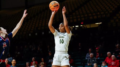 The Green and Gold shifted momentum in the third quarter with a series of 3-pointers from Geddes, who connected on shots at 8:50, 7:03, and 5:34. Mikeska played a crucial role, providing assists on two of those shots and closing the quarter with a fast-break layup at the buzzer that kept W&M in-touch, trailing 58-42.