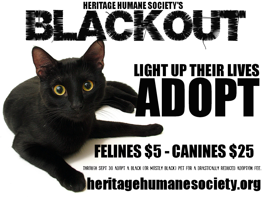 From now until Sept. 30, the Heritage Humane Society is experiencing a “Blackout.” As a part of this month’s Blackout promotion, all black kittens, dogs and adult cats are available at a lower adoption fee.